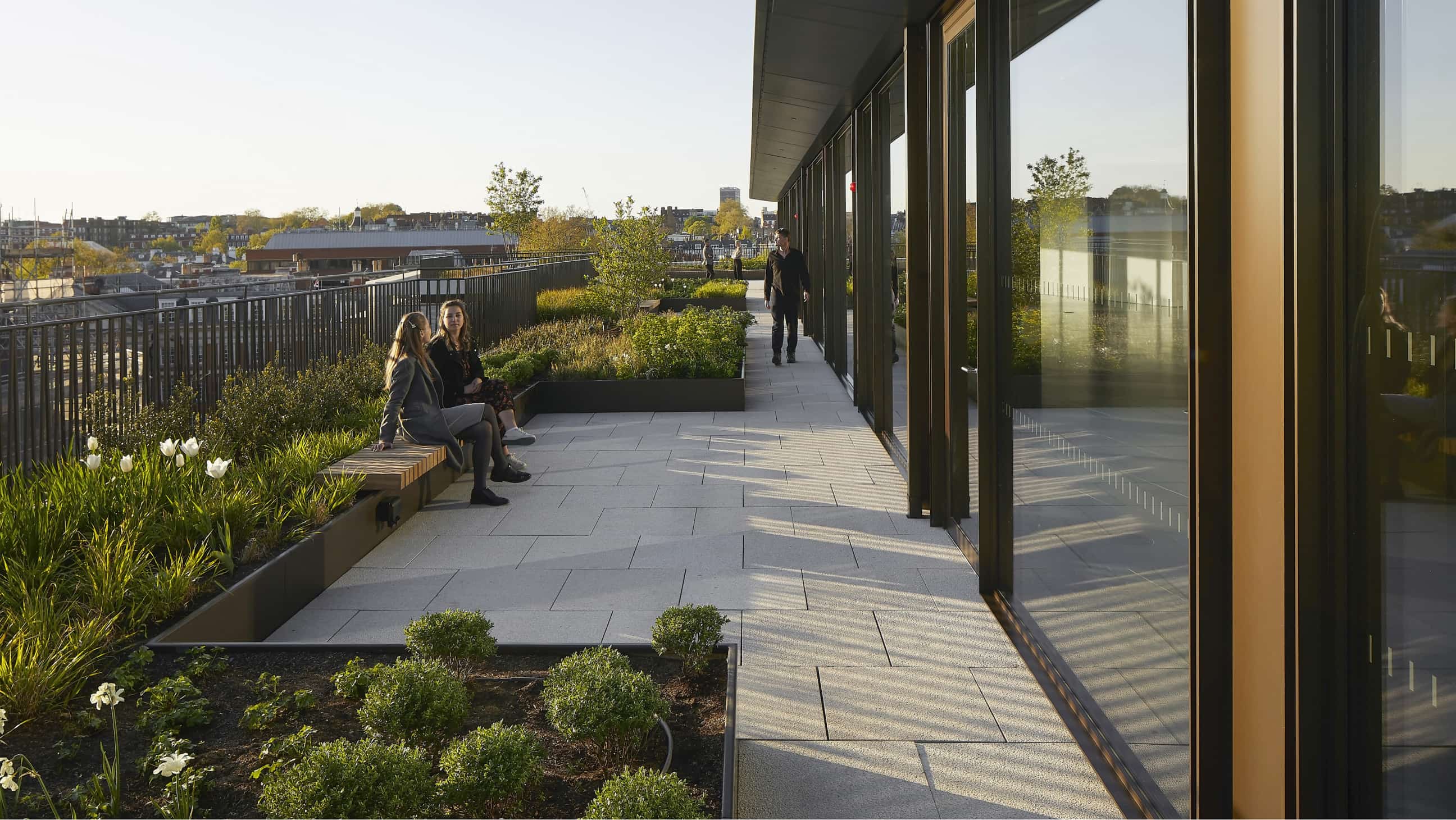 Three large terraces play a key role in the building’s commitment to sustainability and the wellbeing of its people, providing valuable space to breathe, take a break and enjoy the uninterrupted views. The fifth-floor terrace features a showpiece, multi-use space for working gathering and hosting events.